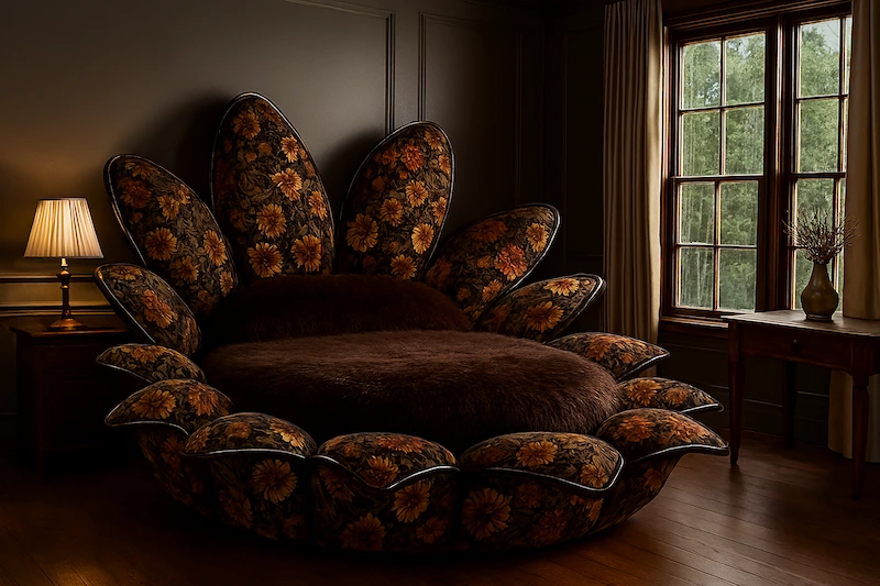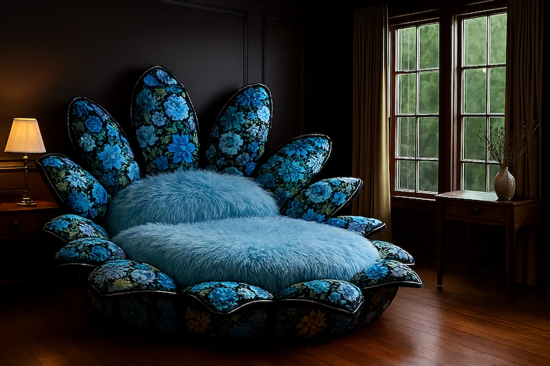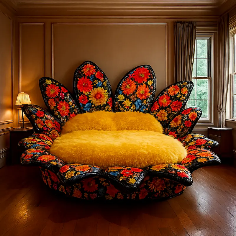 Inspired by the sunflower – a universal symbol of light, positivity, and hope – this bed is designed as if a giant flower were blooming right in the middle of your bedroom. The curved, layered petals embrace the sleeper, while the golden faux-fur center mimics the warmth of a sunflower’s core. Lying here feels like being cradled by nature itself.