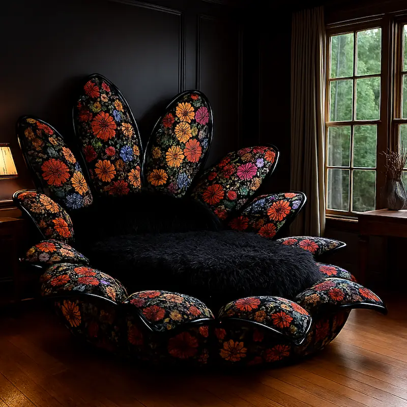 - Petals: upholstered in velvet, linen, or high-quality faux leather, finished with glossy piping.