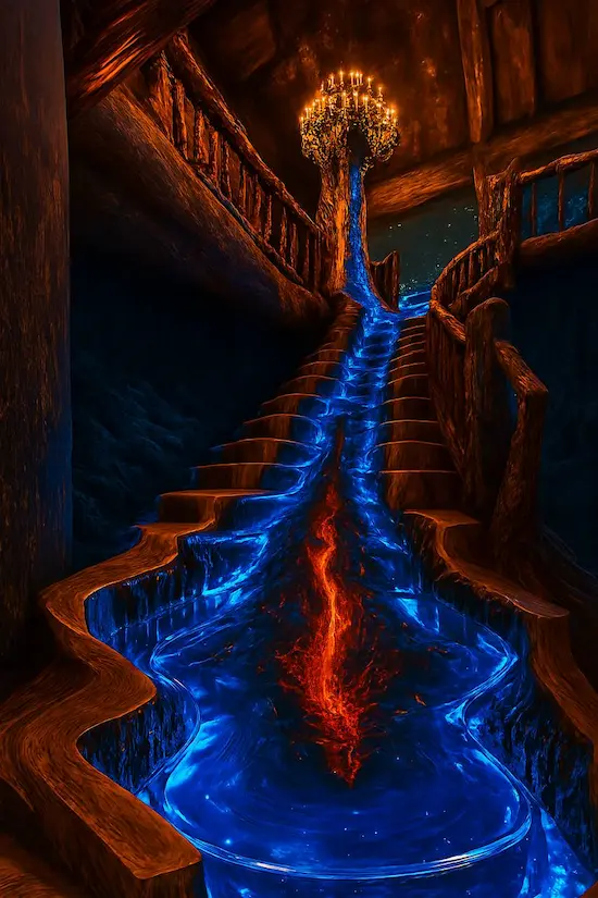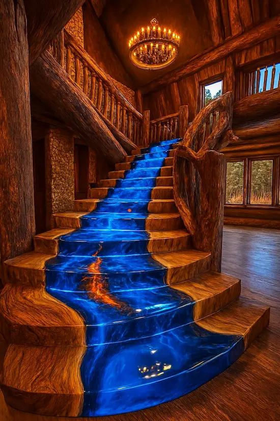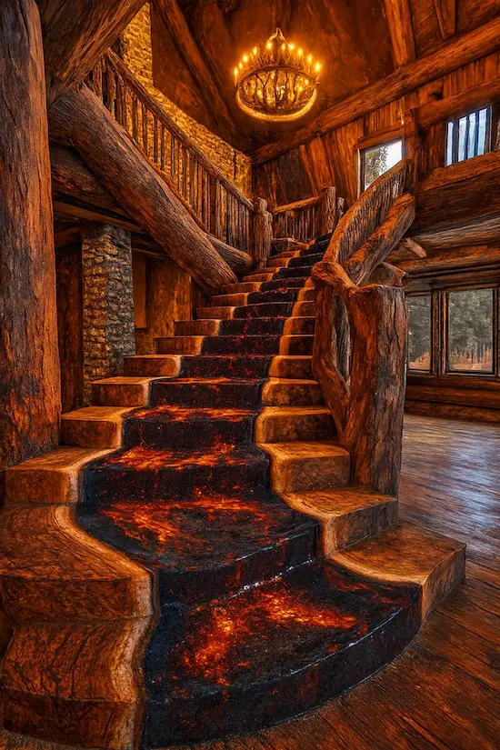The railing of the volcano staircase is also made of wood but treated with a darker tone, like charred tree trunks after an eruption. The contrast between raw wood and fiery epoxy creates a wild yet modern whole.